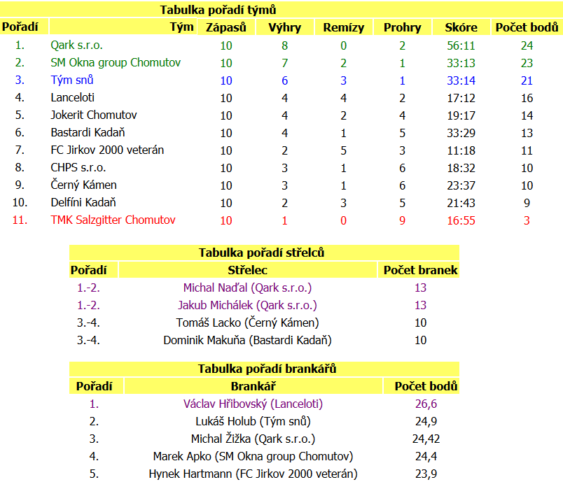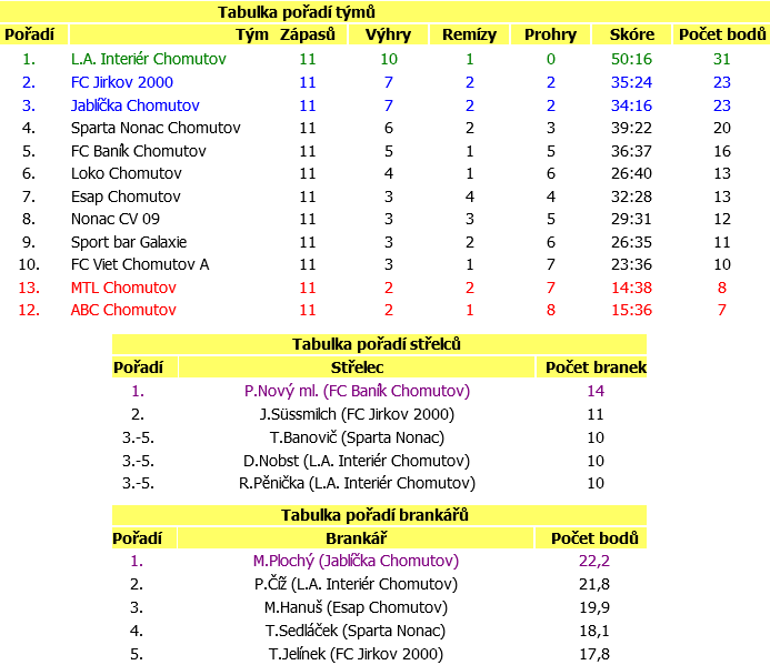 Zelení: Chouň P. - Műller (3), Stoklásek (3), Karfilát (2), Ptáček P.(1), Pálek (1)